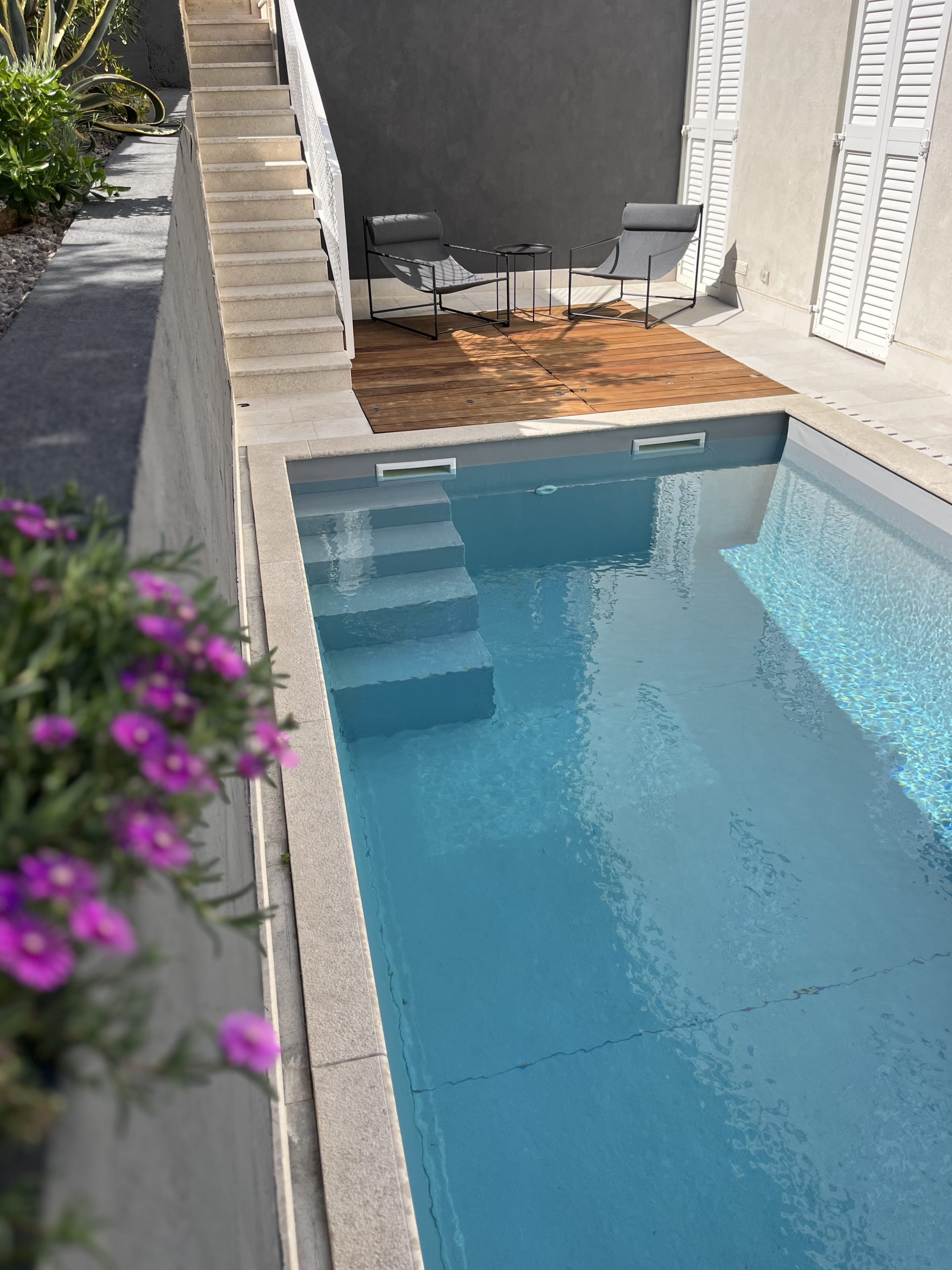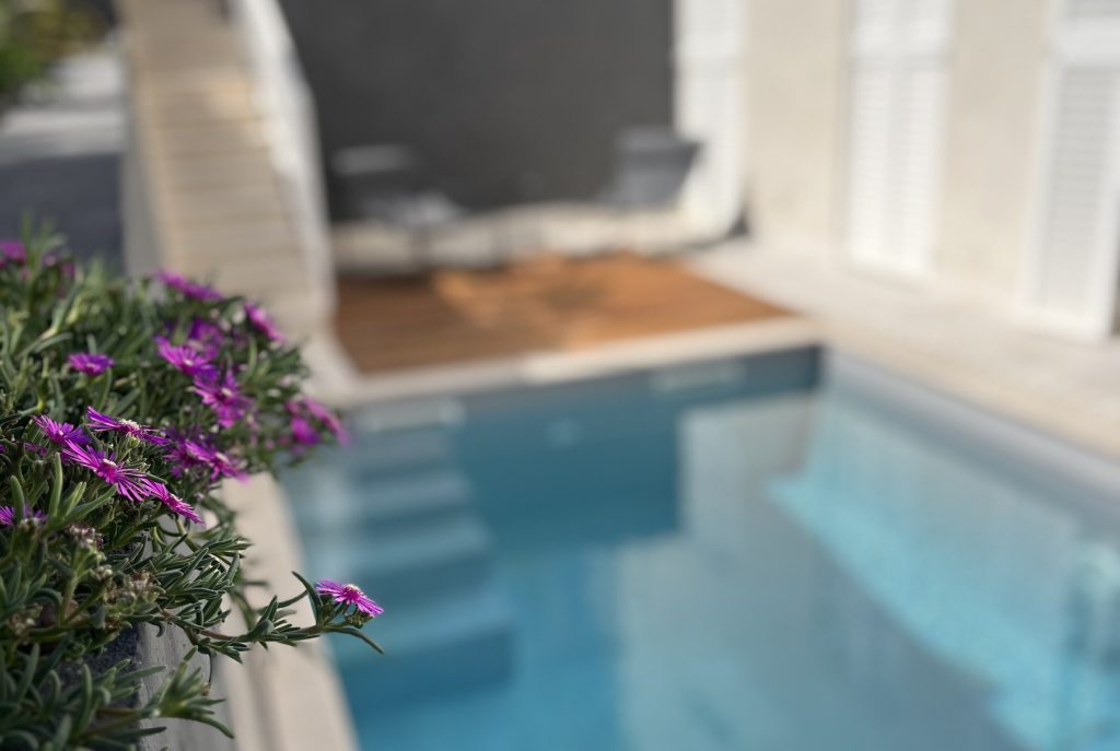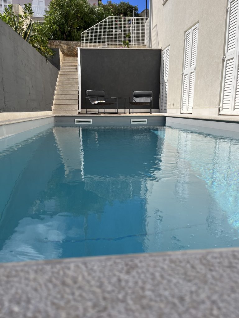 The apartment comprises two bedrooms with comfortable beds (160×200), a bathroom, a practical kitchen, and a pleasant living room. Our guests typically enjoy one of the terraces, relaxing in a deck chair, grilling fish in the stone grill, or having breakfast while enjoying the sea view. If you prefer not to go to the beach, you can refresh yourself in the small charming swimming pool just a few steps down from your terrace.